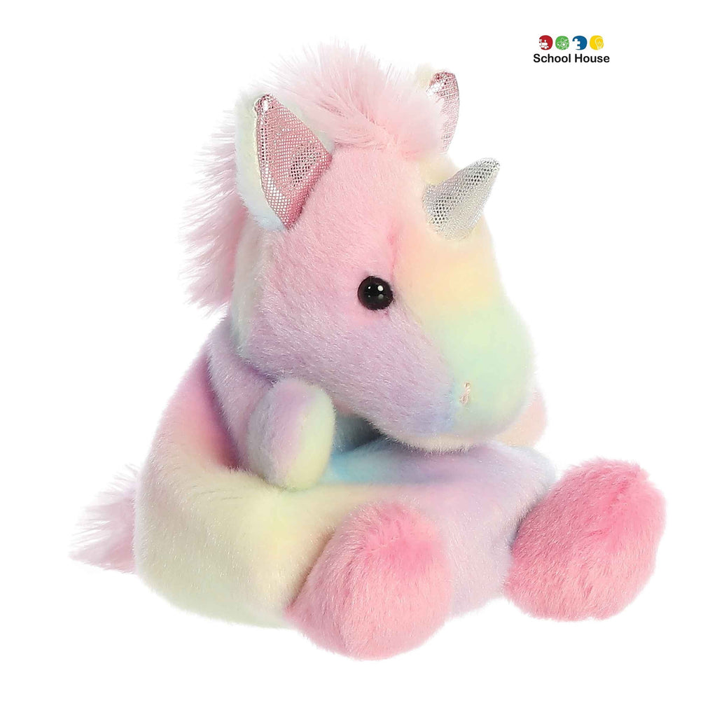 Sorbet Unicorn is a plush unicorn with a pastel rainbow color scheme, featuring shades of pink, purple, blue, and yellow. The plushie has a single silver horn on its head, along with a soft pink mane adding to its enchanting and whimsical appearance.