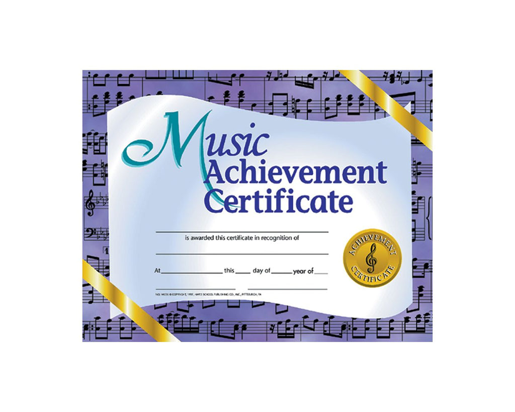 Certificate reads: Music Achievement Certificate _____ is awarded this certificate in recognition of _____ At _____ this _____ day of _____ year of _____.