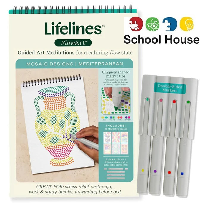 Mediterranean Mosaics includes 20 meditative scenes and four double-sided "shape" markers (8 vibrant colors) in a detachable storage tray.