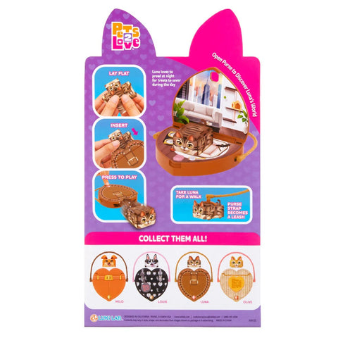 Open the top of the purse to reveal each pet’s cozy hideaway to play.