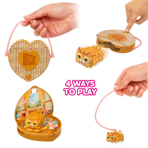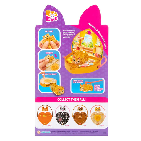 Open the top of the purse to reveal each pet’s cozy hideaway to play.