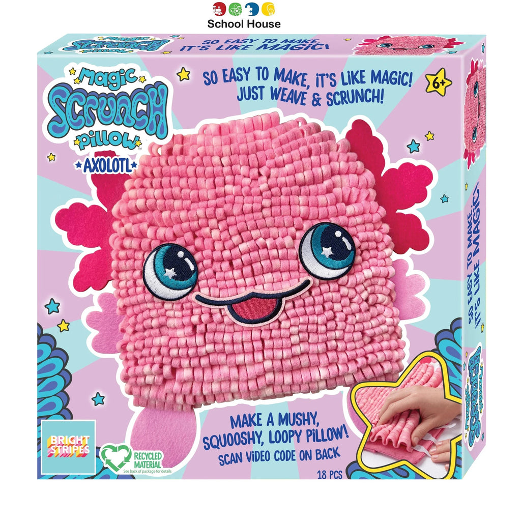 The Scrunchy Axolotl has beautiful, embroidered peel-and-stick features and felt head ferns and legs that weave right on. The super-soft, thick fleece, felt pieces and pillow stuffing are all made of 90-100% post-consumer plastic bottles!