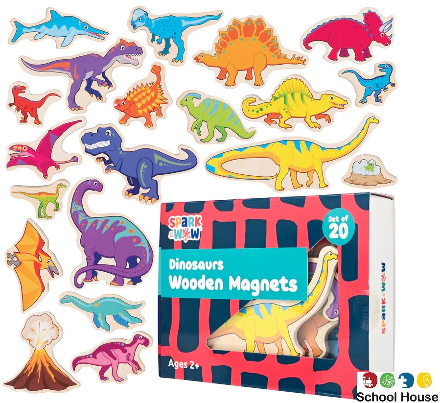 - 20 DIFFERENT DINOSAURS -- This wooden magnet set features 20 vibrant, colorful dinosaur magnets in 20 different shapes. Decorate and play with a T. rex, velociraptor, pterodactyl and more!