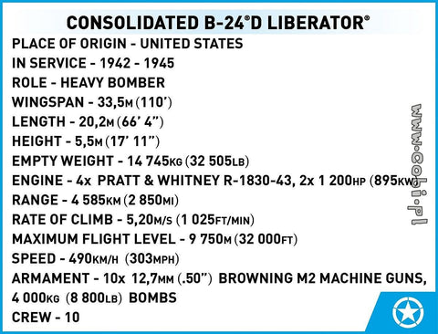 The B-24 Liberator was an American long-range heavy bomber and patrol aircraft, also used to combat U-boats. The Liberator was designed and built by the American Consolidated Aircraft Corporation. Its task was to bomb remote cities, factories, bases and other enemy targets. With the entry of the US into World War II, production of the aircraft increased. This aircraft was armed with 8 to 10 12.7 mm machine guns and could carry up to 3.6 tons of bombs, cargo and personnel. Build history, piece by piece, with COBI.